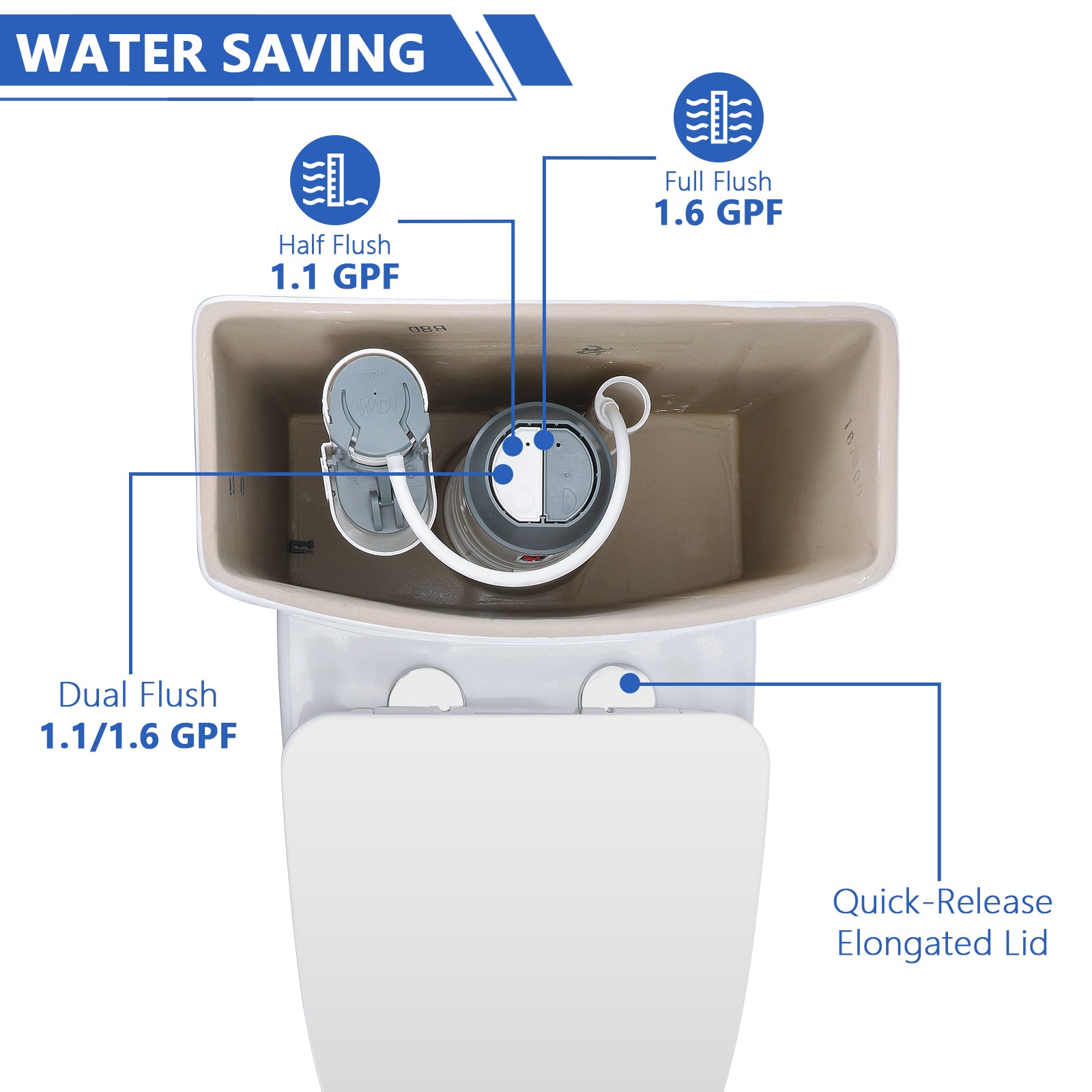 - 【Powerful Dual Flush】Siphon Flushing. Dual Flush 1.1/1.6 GPF. Maximum flush of 1.6 GPF, which can effectively eliminate clogging problems. 1.1 GPF can help saving on your water bill. Dual flush toilet fully glazed flush. Super-quiet and powerful flush with no clogs. Leak-proof.